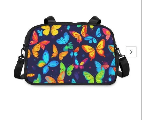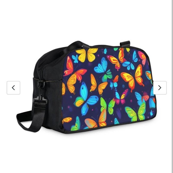 This vibrant fitness bag features a striking design of colorful butterflies against a dark background. Made with durable materials, it includes a resilient handle and an adjustable shoulder strap for comfort. Perfect for gym-goers and travelers, this bag combines functionality with a bold, eye-catching style.