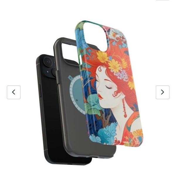 Elevate your iPhone 15 with this stunning case featuring an elegant, vibrant depiction of a woman adorned with floral accents.