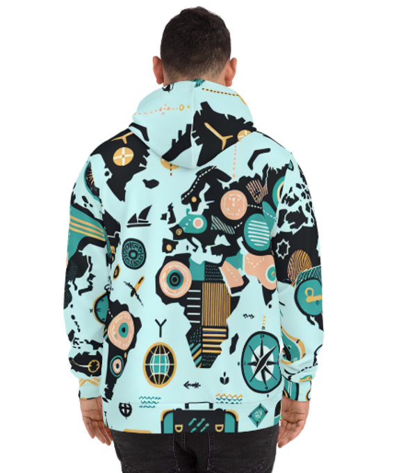This men's fashion hoodie features a blue sky travel map design, perfect for those with wanderlust. The adjustable hood, spacious pocket, and comfortable fabric make it ideal for chilly days exploring new places. Great for travelers, adventurers, and anyone looking to add a touch of wanderlust to their wardrobe. Perfect for holidays or graduation gifts.