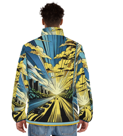 Men's Graphic Puffer Jacket, Urban Streetwear, Unisex Winter Coat, Bold Artistic Outerwear, Gift for him, Travel Jacket
